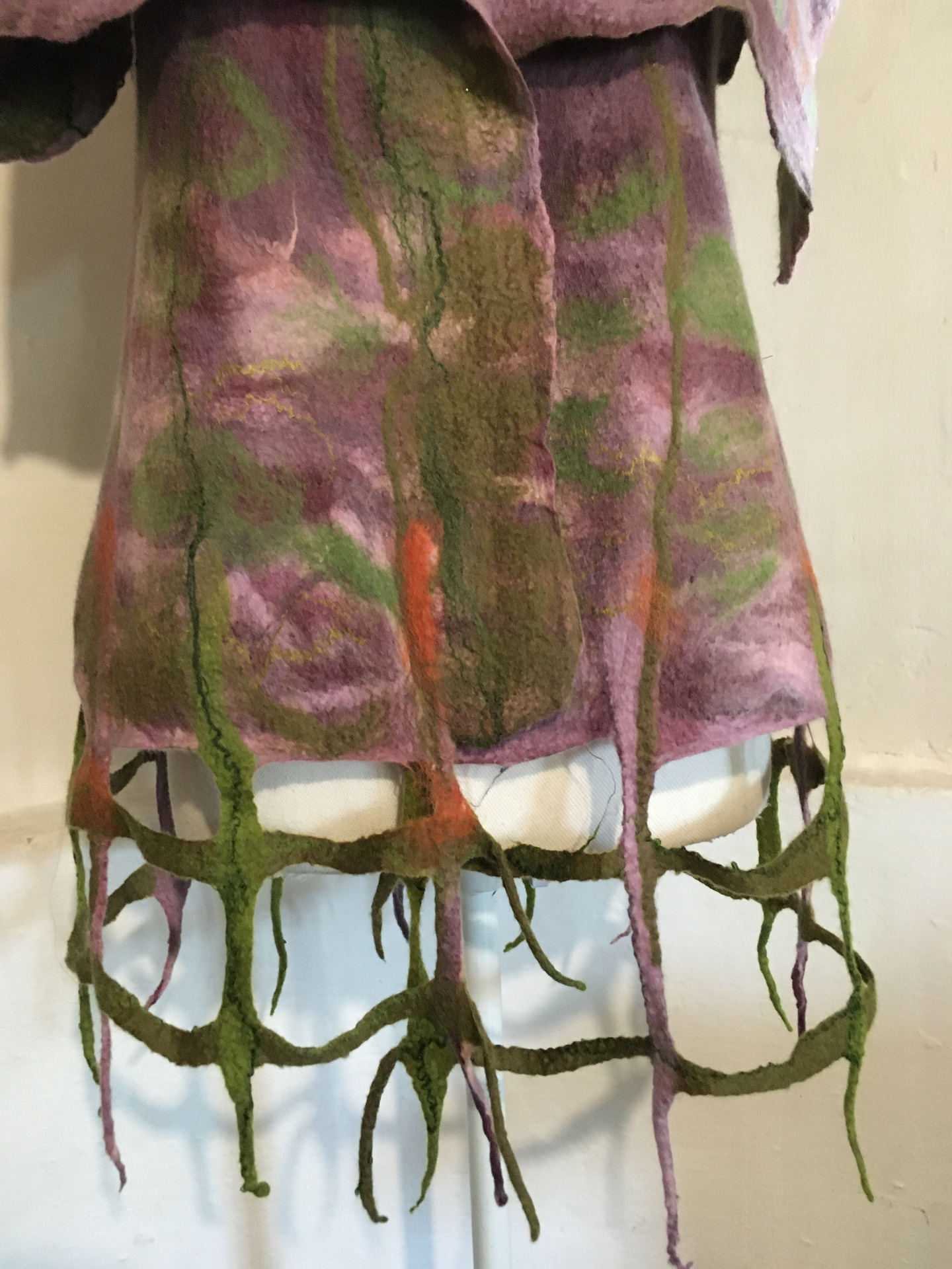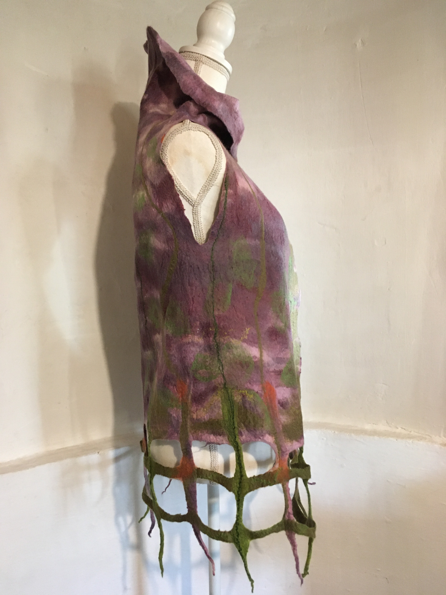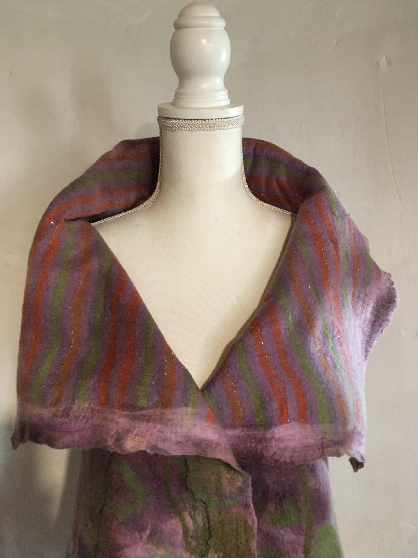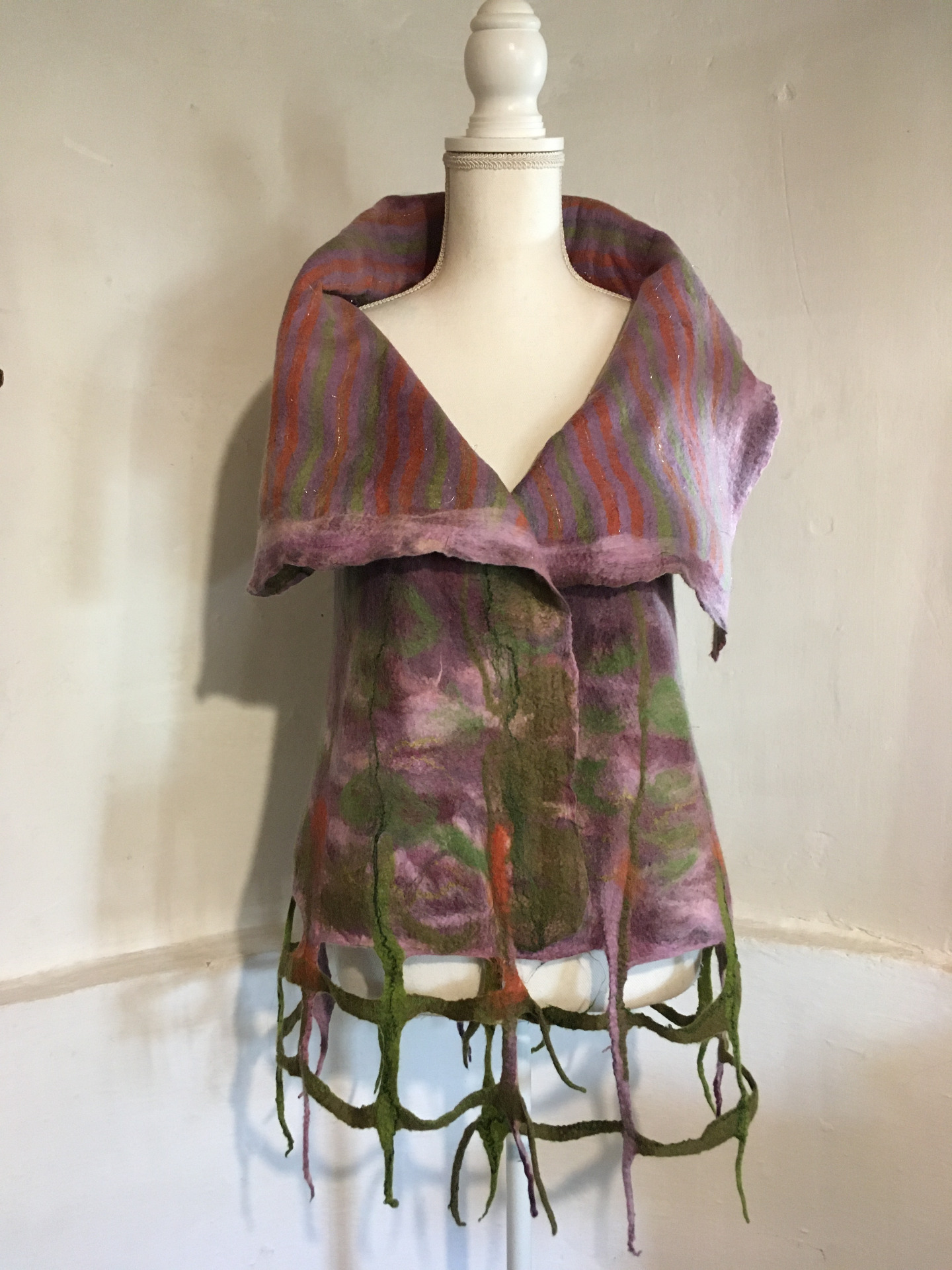 Alján rácsos mintázatú végződés. Átlapolós, brossal tűzhető, széles gallérú.