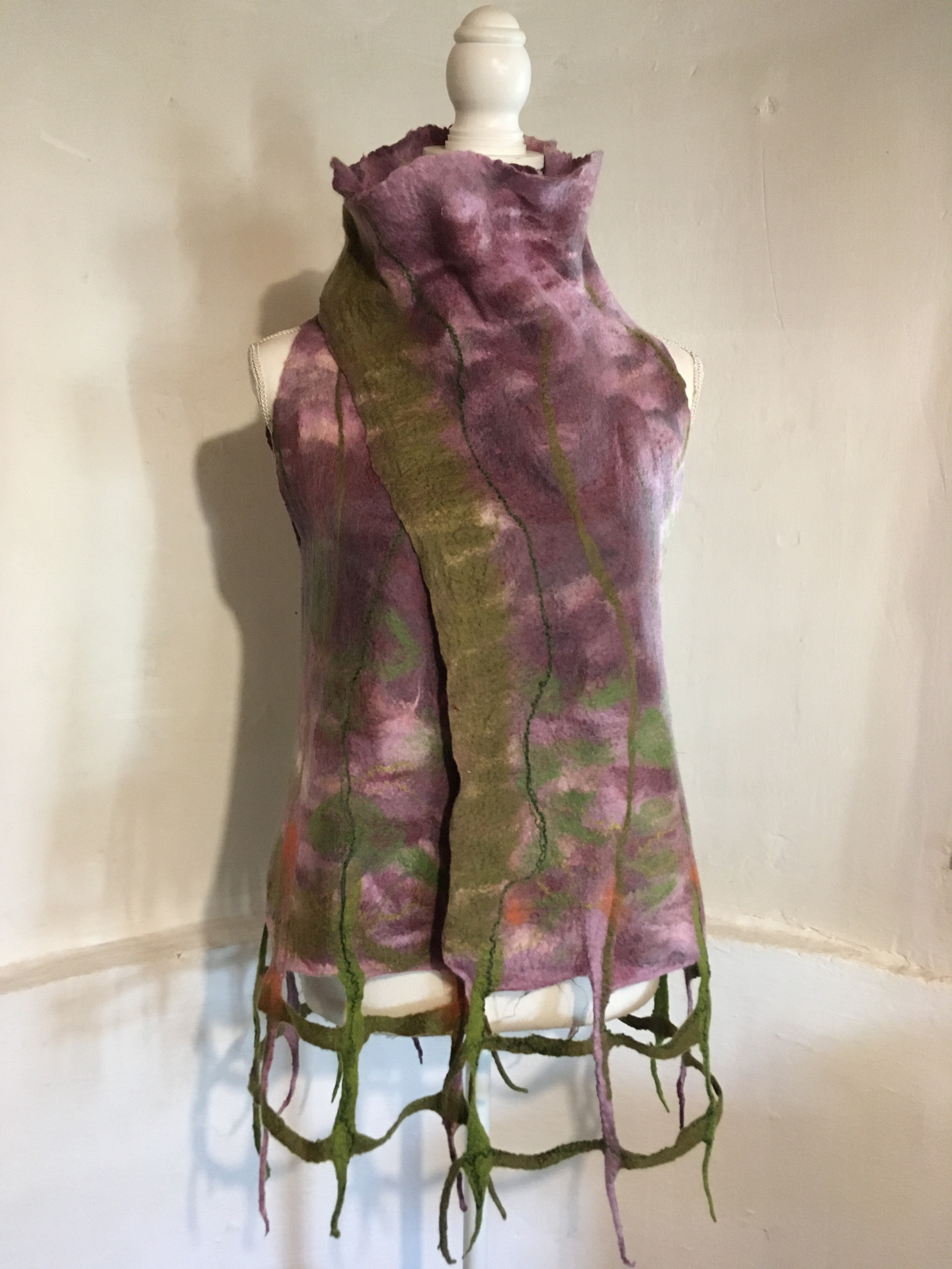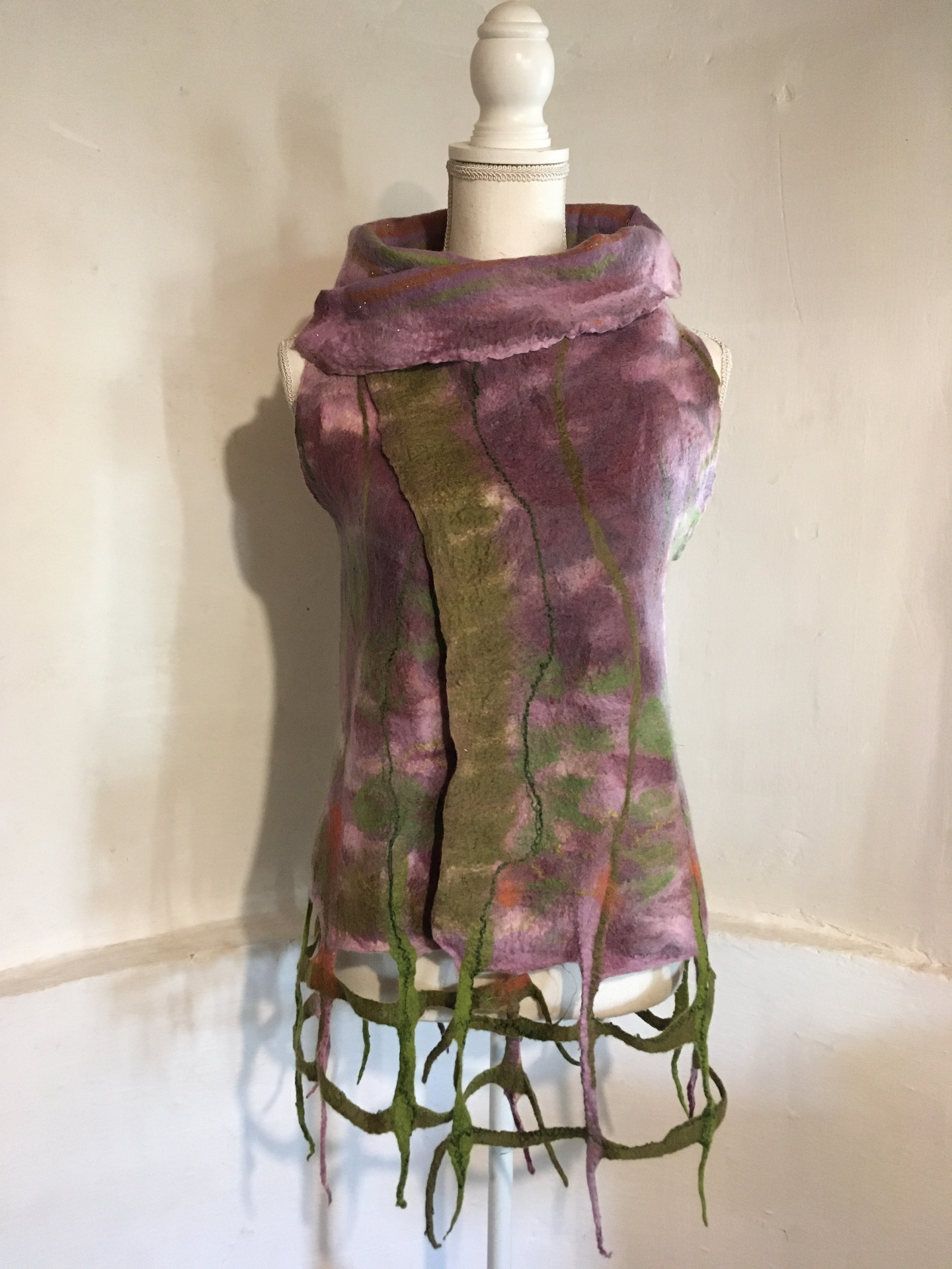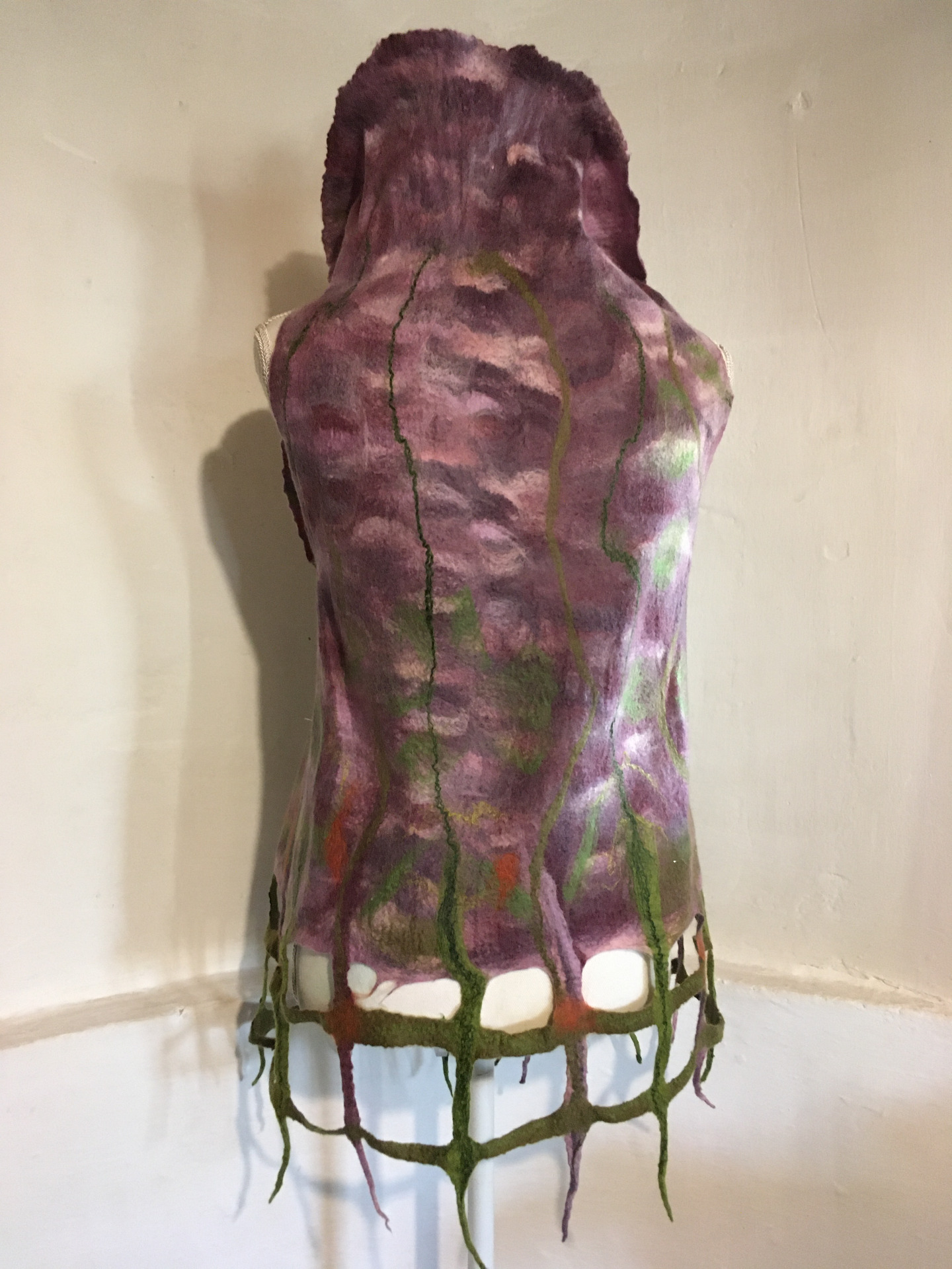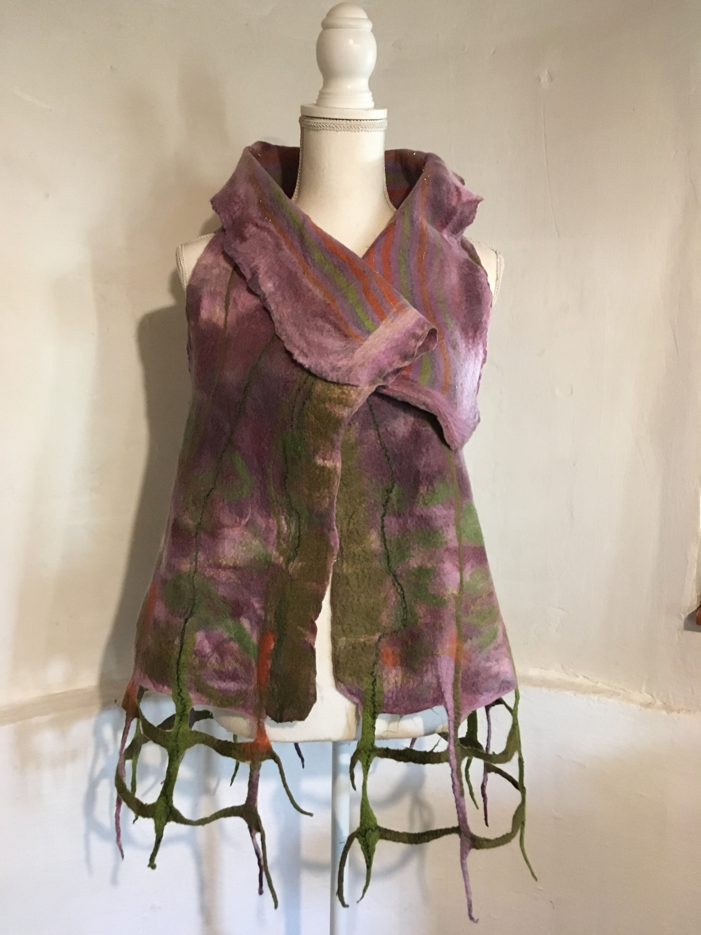 Alján rácsos mintázatú végződés. Átlapolós, brossal tűzhető, széles gallérú.